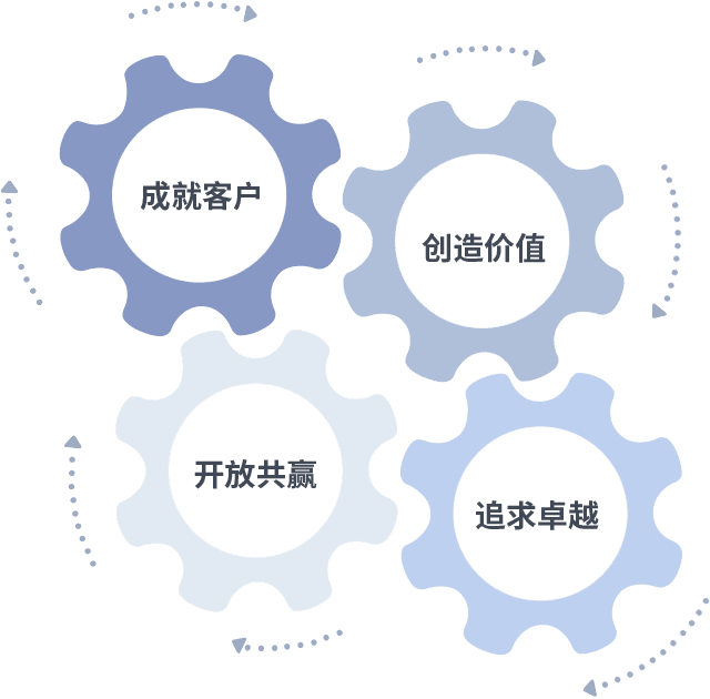 成就客户是一切决策的出发点,,,创造价值是衡量所有工作的标准,,,追求卓越是我们做事做人的态度,,开放共赢是我们的格局也是最终的结果。。。。价值观的齿轮环环相扣,,,,推动着组织里的每个人不断向前。。。。